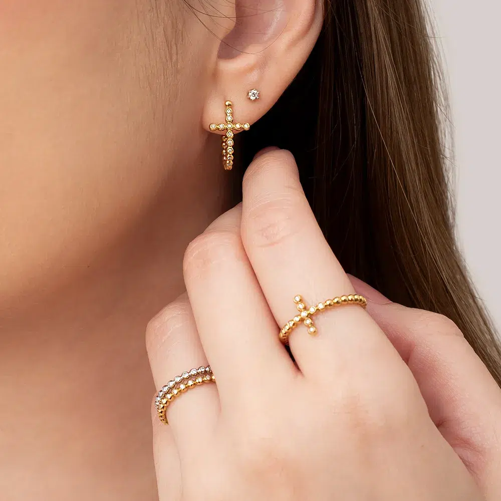 A Argola Cruz com Diamantes em Ouro Amarelo 18K apresenta um símbolo clássico de fé e proteção reinterpretado pelo olhar Mingotti. A cruz preserva sua força simbólica em uma leitura discreta e atemporal, traduzindo espiritualidade com elegância e sobriedade.
