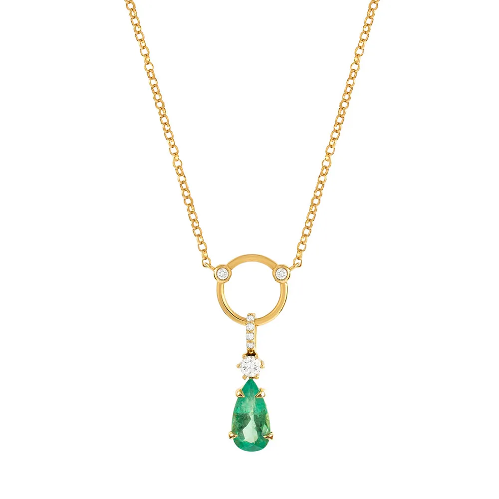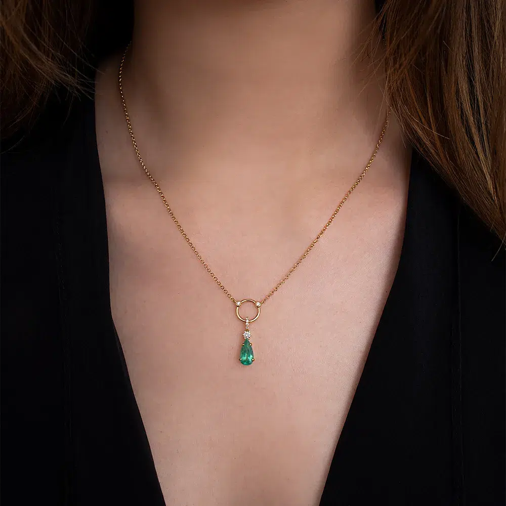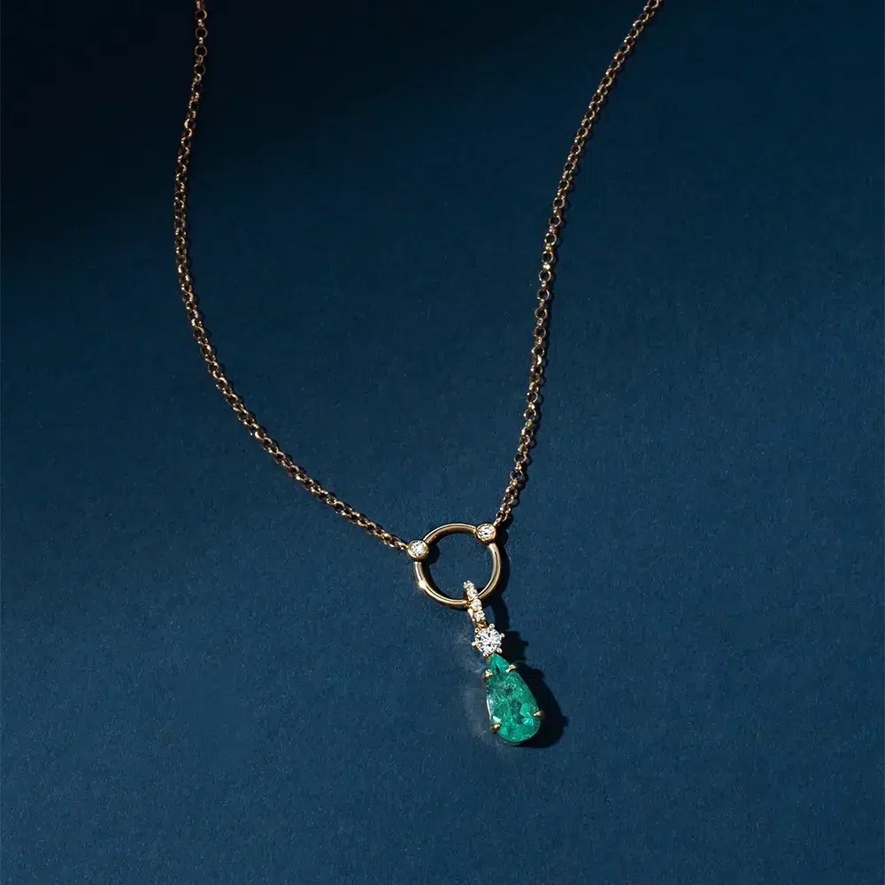O Colar Esmeralda e Diamantes é uma criação autoral em Ouro Amarelo 18K e integra a Coleção Unique. A joia nasce a partir de uma gema rara e singular, cuja beleza orienta todo o desenho, acompanhada por diamantes que ampliam o brilho e a presença da composição.