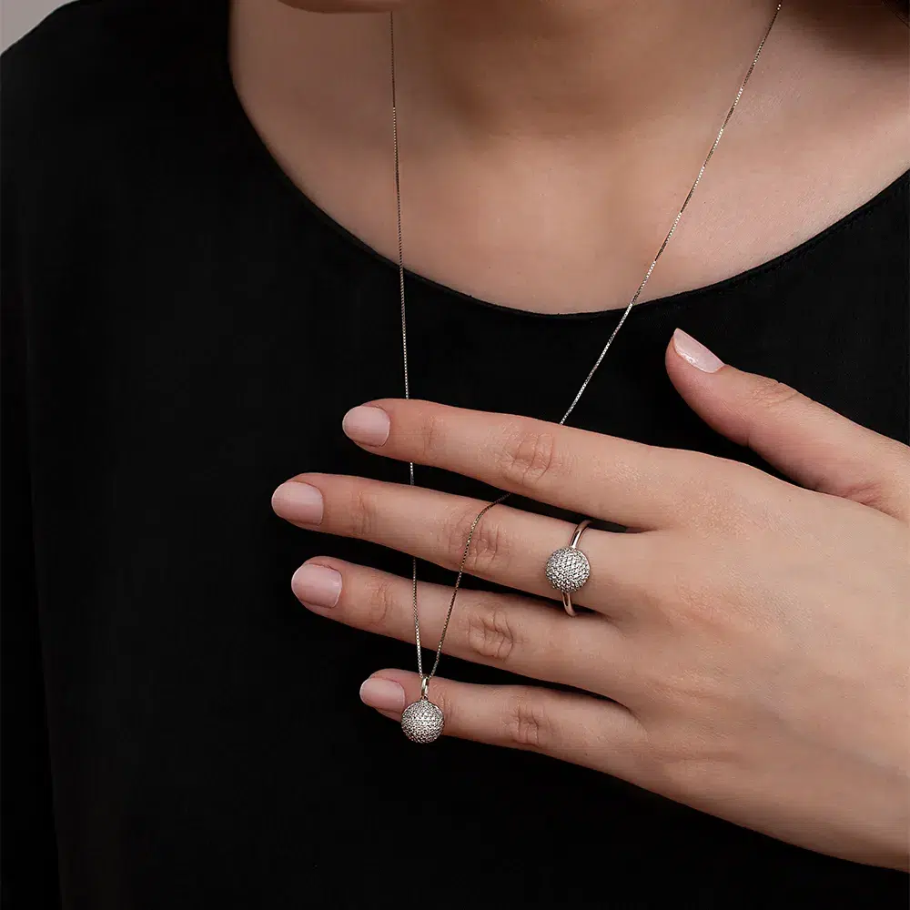 Nas joias Vega Pavê, a luz atravessa a Via Láctea e se multiplica em uma superfície quase inteiramente cravada de diamantes. Os artesãos Mingotti posicionam cada pedra com precisão e constroem, com técnica e sensibilidade, um campo contínuo de brilho intenso e sofisticado.