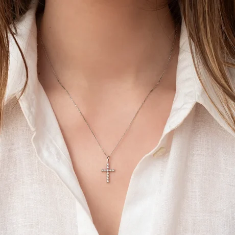 O Pingente Cruz Bolinhas com Diamantes em Ouro Branco 18K apresenta um símbolo clássico de fé e proteção através do olhar Mingotti. A cruz preserva sua força simbólica em uma leitura discreta e atemporal. O desenho valoriza proporções, acabamento e cravação e acompanha diferentes momentos com sobriedade e significado.
