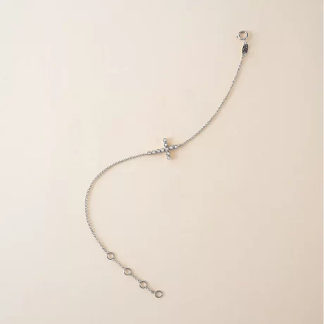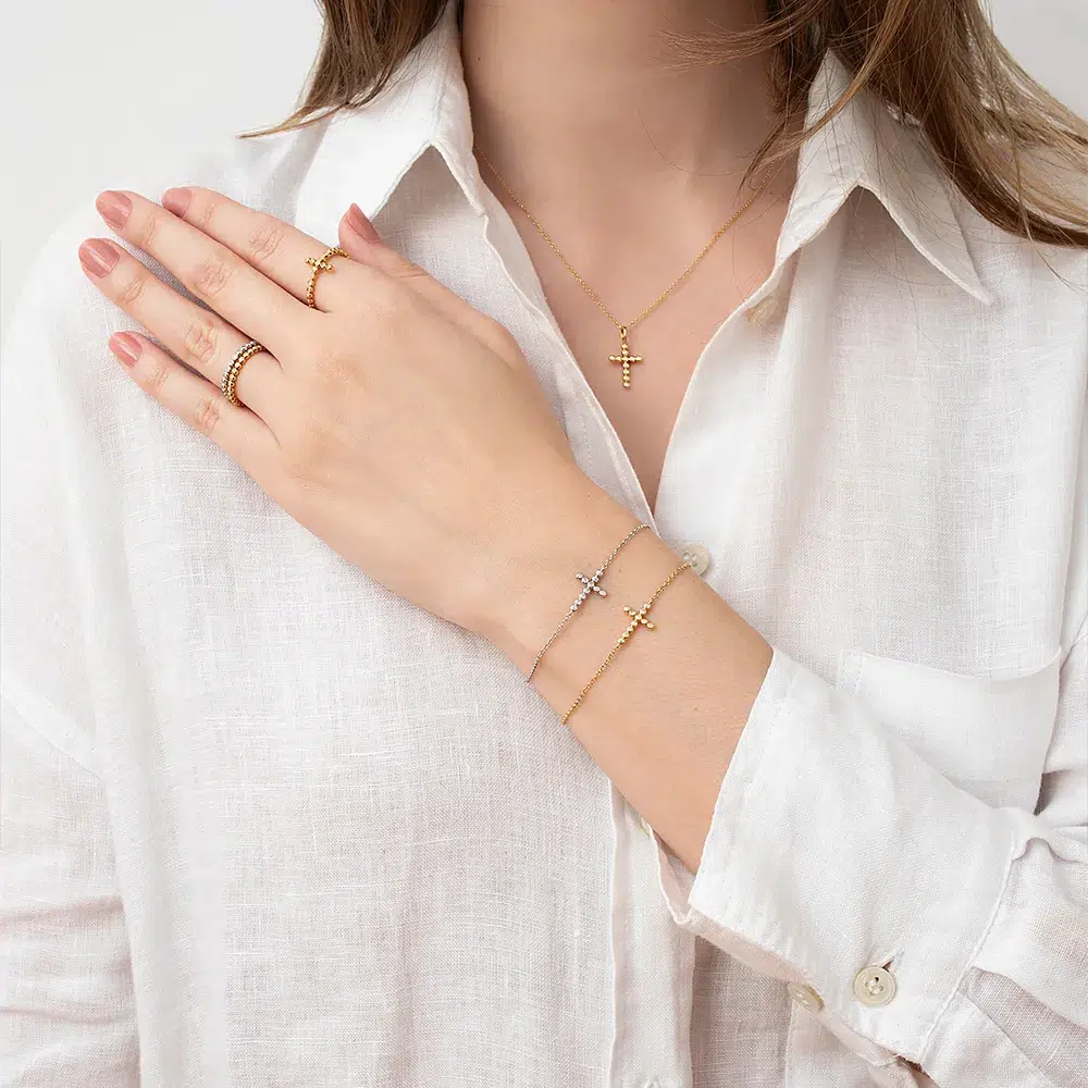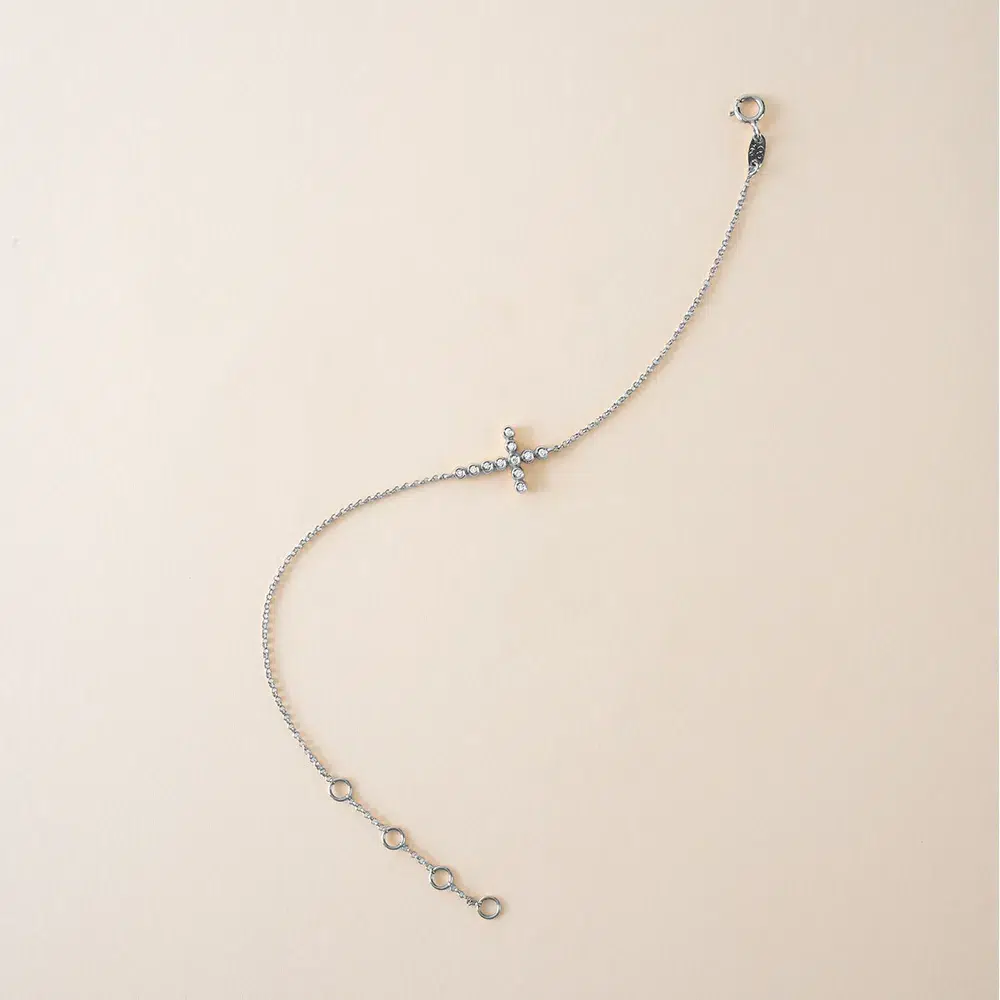 A Pulseira Cruz com Diamantes em Ouro Branco 18K apresenta um símbolo clássico de fé e proteção reinterpretado pelo olhar Mingotti. A cruz preserva sua força simbólica em uma leitura discreta e atemporal, traduzindo espiritualidade com elegância e sobriedade.